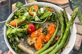 Open fire walleye with blistered tomato pan sauce, asperagus and garden salad